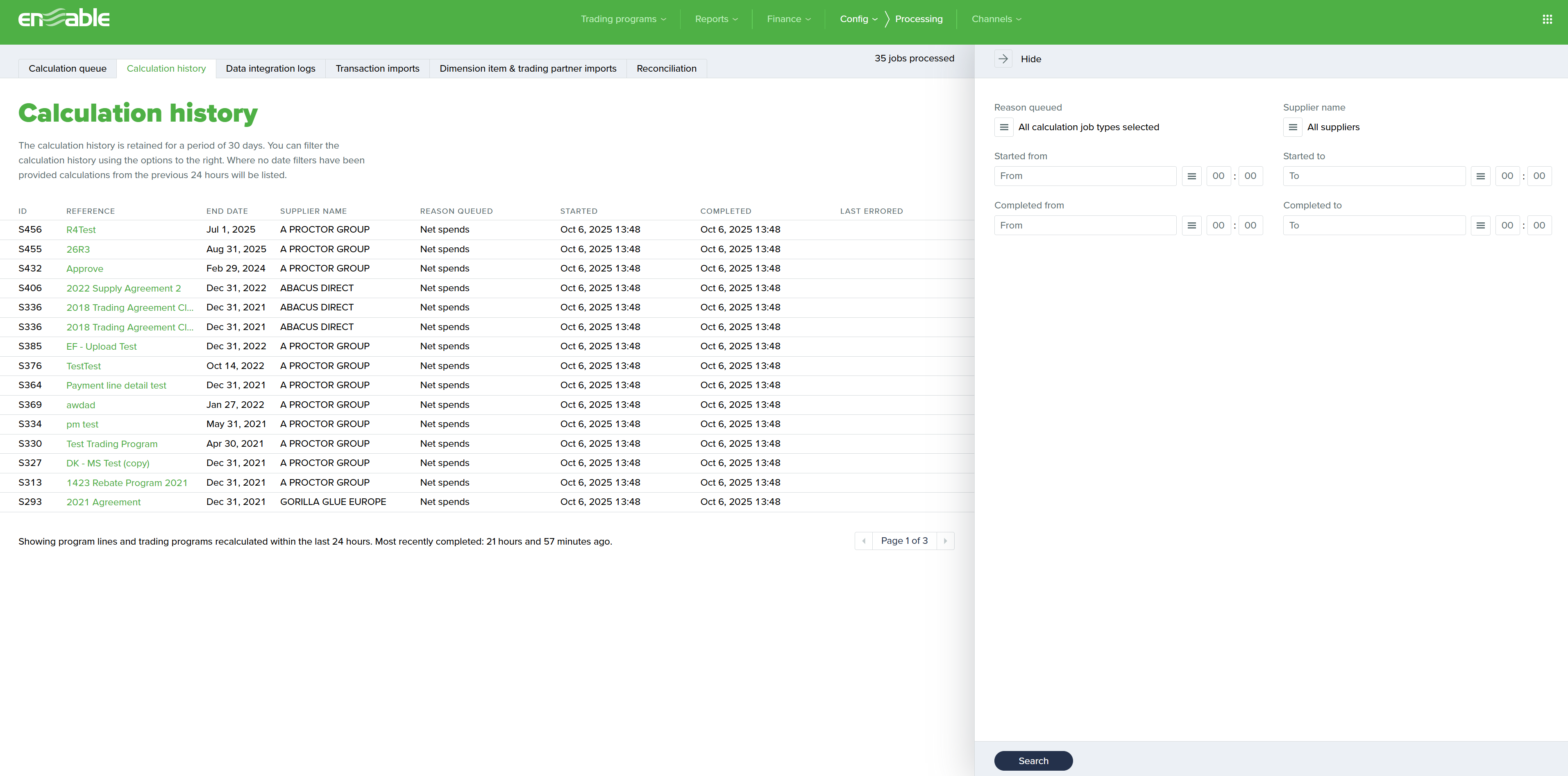 As you can see in the screenshot above, you can filter by Supplier name, start date and time of the calculation, the completed date and time of the calculation, and the reason the calculation was queued.