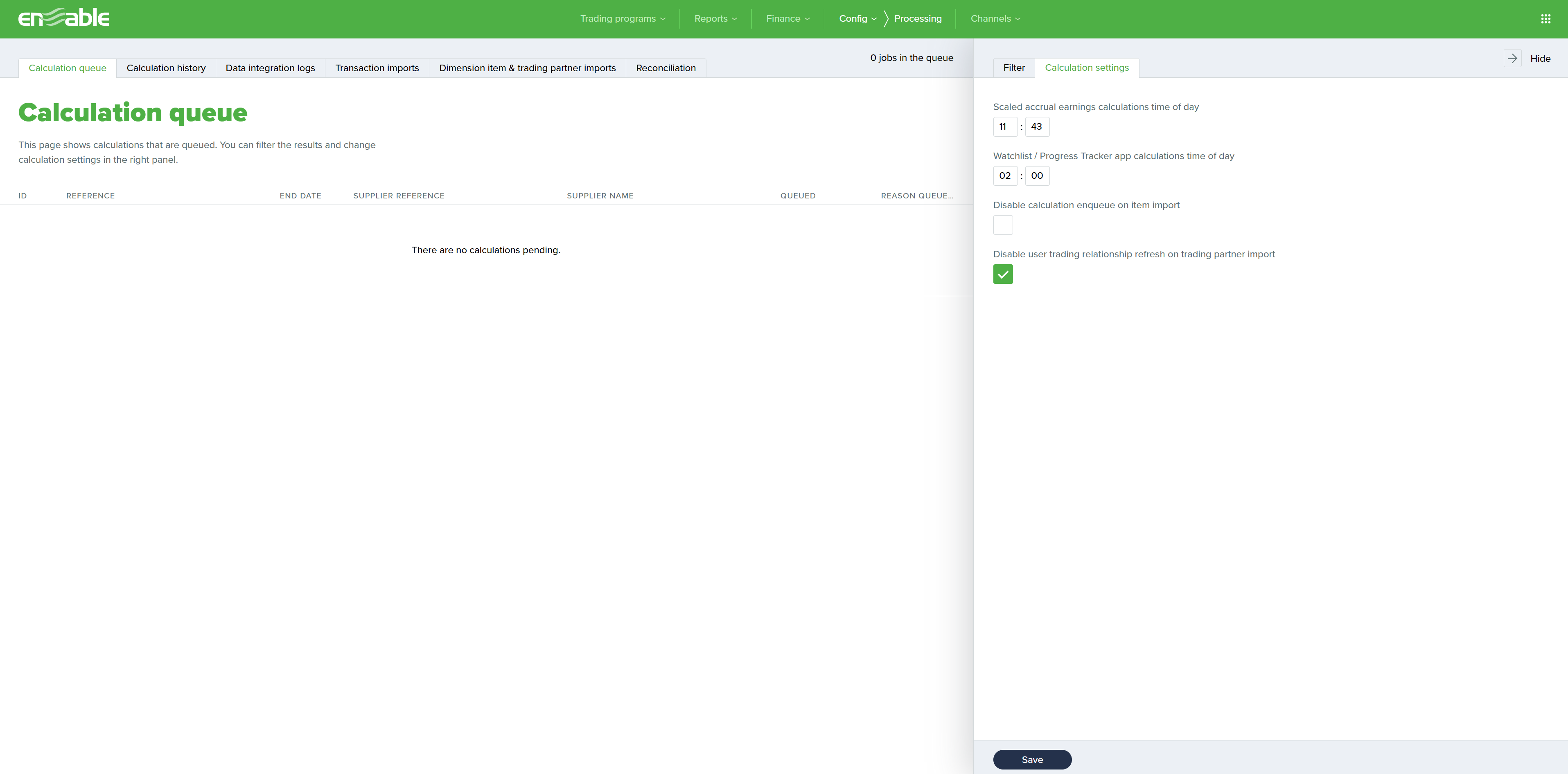 It is possible for admin users to easily configure the timings of the calculation process themselves. To do this, click on Config at the top of your screen and then on Processing in the drop-down menu.